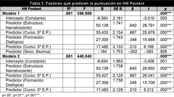 El modelo realizado explica el 88% de la varianza y predice que sobre la puntuación del postest en habilidad narrativa incide, en orden de mayor a menor medida: visualizar episodios de David el Gnomo con estructura narrativizante, cursar 5º de Educación Primaria, recibir formación dialógica y cursar 3º de Educación Primaria. El sexo del alumnado, en cambio, no ha resultado estadísticamente significativo.