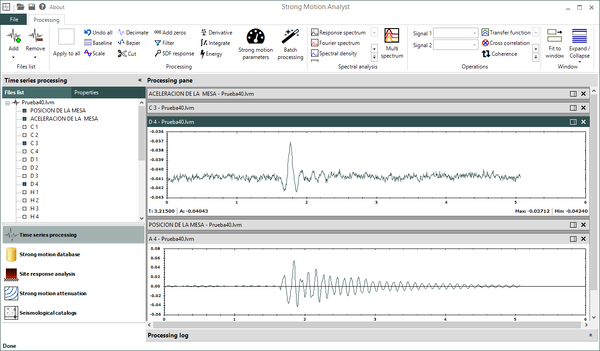 En la pantalla del módulo, se presenta el listado de acelerogramas disponibles, junto con toda la información asociada a cada uno, así como una previsualización de las señales.