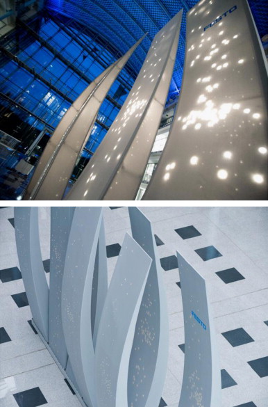 Fig. 18. Top: The InteractiveWall at the Hannover Messe 2009 displaying real time behaviour by swinging its body back and forth, displaying patterns of light on its skin, and projecting localised sound. |