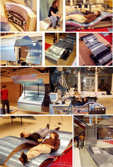 Fig. 20. Top: The Muscle Re-configured being tested for cumulative curvature variations of all three elements (seating, walls and roof), Bottom: The Muscle Re-configured inviting users to interact with it with its pro-active behavior at the TU Delft, The Netherlands. |