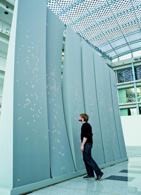 Fig. 17. The skin of each InteractiveWall covered by a unique, irregular distribution of dynamically controlled LEDs that form a highly reactive interface. |