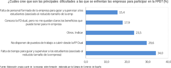 Entre las razones principales de esta escasa participación por parte de las empresas, podría estar la reducida dimensión de las empresas españolas que determina que no dispongan de tiempo para la supervisión de los estudiantes (36,4%), no cuenten con puestos de trabajo a cubrir por la FPD (33,3%) o les falte personal formado en la empresa para guiar a los estudiantes (15,4%).