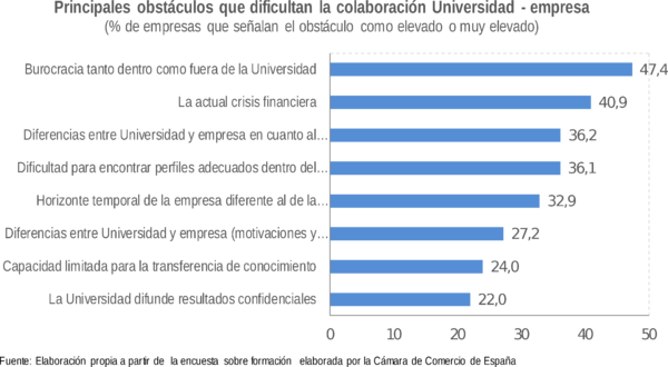 Por otra parte, el sistema universitario español presenta buenos resultados en la generación de conocimientos, pero adolece de diversas debilidades, como la reducida vinculación con la empresa, la gestión burocratizada, la escasa transferencia de conocimientos del sistema de I+D+i a las empresas, la masificación en determinadas titulaciones, la lenta adaptación a las nuevas demandas o el insuficiente estímulo del espíritu emprendedor. De hecho, apenas un tercio de las compañías españolas (36,2%) ha colaborado con las universidades en su actividad productiva.