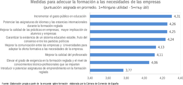 En particular, la gran mayoría de las compañías españolas considera necesario disponer de un sistema educativo estable y con los recursos públicos precisos para garantizar un capital humano de calidad y adecuado en mayor medida a sus necesidades competitivas. Adicionalmente, casi el 80% de nuestro tejido empresarial solicita potenciar las asignaturas de idiomas y las estancias internacionales durante la formación reglada. La puntuación asignada a esta medida, en una escala de 1 a 5, se eleva hasta el 4,26, como revela el Gráfico 3.