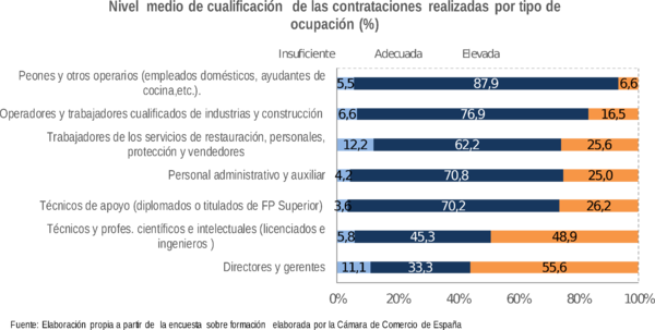 El citado estudio revela asimismo una correlación positiva entre el nivel de formación requerido y la responsabilidad del puesto de trabajo. Al tiempo, a medida que disminuye el nivel de cualificación y responsabilidad del trabajador, aumenta el porcentaje de empresas que considera que la formación del empleado es adecuada a su demanda, pero no elevada. Así, conforme ilustra el Gráfico 2, mientras más del 55% de las empresas afirman que el nivel medio de cualificación de gerentes y directores es elevado y un 48,9% en el caso de licenciados e ingenieros, este porcentaje se reduce a un 25,0% en el caso del personal administrativo y auxiliar; un 16,5% para operadores cualificados de industrias y construcción y un 6,6% en el caso de peones y otros operarios. Estos datos romperían con el mito sobre la sobrecualificación de los empleados para el desempeño de sus ocupaciones reales.