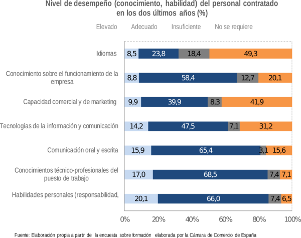 Los aspectos en los que las compañías españolas encuentran más desajustes entre la capacitación de sus empleados y sus necesidades reales se corresponden con los idiomas y el conocimiento sobre el funcionamiento de la organización en el seno de las empresas.