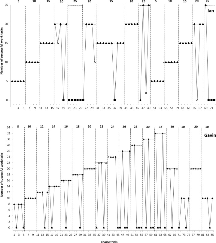 The number of tasks to be completed was increased incrementally across trials to determine the point at which each participant chose break instead of work. Trials were increased by 5 for Ian and by 2 for Gavin throughout the choice assessment. The goal was to find the maximum amount of work the participant would choose to complete rather than choose the break option. When Ian chose ‘break’ in 50% or more of the trials, the number of tasks was reduced and then increased again in order to replicate the effect. The number of tasks required of Gavin continued to increase until he reached 32 tasks, at which time experimenters and staff agreed that 32 was a sufficiently high number of tasks and to reduce the number of tasks required to avoid the risk of Gavin having an aversive experience of exposure to long ratios (Dardano, 1973 ). For both participants, a changing criterion design was used to demonstrate experimental control (Gast & Ledford, 2014 ).