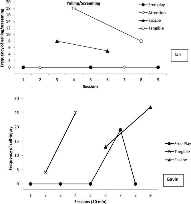 Figure 1. Frequency of challenging behavior across the functional analysis conditions for Ian (top panel) and Gavin (bottom panel). |