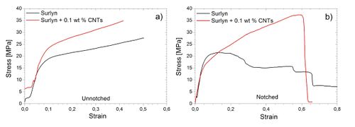 Tensile strength of the unreinforced polymer decreased a 45 % after the printing process of the unreinforced polymer, but the mechanical property is recovered due to the beneficial effect of the MWCNTs added to the polymer. The improvement in the mechanical response of the nano-reinforced polymer is clearly seen in Fig. 2b regards to that of the unreinforced polymer.