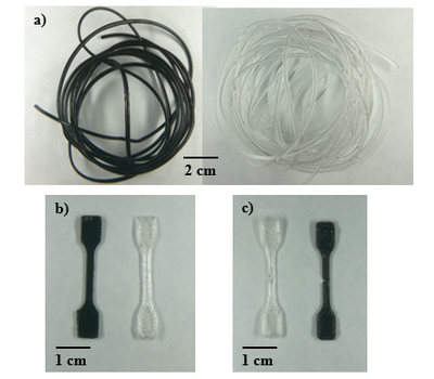 Filaments of 1.75 mm of diameter were manufactured by means of a polymer extruder from pellets of the Surlyn® ionomer. The extrusion parameters were optimized to obtain a homogeneous filament in terms of composition and diameter. Fig. 1a shows the obtained filament (right image). The material is transparent, as the original pellets, and free of imperfections or air gaps inside. The material consistency is similar to that obtained using a hot plate to produce plates of material[7]. Meanwhile, the MWCNTs reinforced filament is completely black (Fig. 1a, left image), revealing the good dispersion of the nano-reinforcements achieved in the thermoplastic matrix using the pre-mixing chamber and the subsequent extrusion step. The filament was homogeneous in its whole extension and free of air gaps or imperfections.