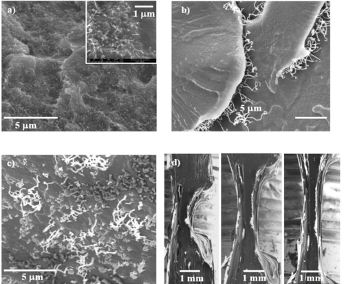 Fig. 3a shows the fracture surface of the extruded filament and the good dispersion of the MWCNTs in the polymeric matrix. It can be seen how MWCNTs are perfectly embedded in the matrix (insert). The beneficial effect of the CNTs in the printed samples is seen (Figs. 3b and 3c). Good dispersion of the reinforcements was maintained during the printing process. Some of the MWCNTs were partially pull-out during the breaking of the specimen, increasing the tensile strength of the final nanocomposite, but maintaining some of the length of the MWCNTs immersed in the matrix, indicating the good adhesion with the matrix.