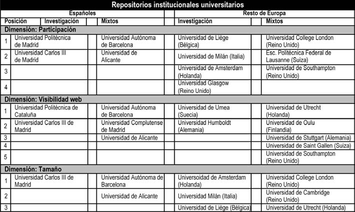 Centrándonos en el mercado español de los repositorios, cabe destacar que en el momento actual ya son seis las universidades españolas que han conseguido posicionar sus repositorios entre los Top50 repositorios institucionales a nivel europeo. Tal es el caso de los repositorios desarrollados por las Universidades Autónoma de Barcelona, Politécnica de Cataluña, Alicante, Complutense de Madrid, Politécnica de Madrid y Carlos III de Madrid. Profundizando en el estudio del contexto nacional y destacando las primeras posiciones en las dimensiones analizadas, los resultados del estudio permiten concluir que son las Universidades Carlos III de Madrid y la Autónoma de Barcelona aquellas que poseen el repositorio más consolidado de investigación y mixto, respectivamente. Si bien, el liderazgo por cuota de participación en el segmento de los repositorios de investigación lo detenta la Politécnica de Madrid, la Autónoma de Barcelona lidera el segmento de los repositorios mixtos. Por su parte, en cuanto a penetración de mercado, el liderazgo corresponde a los repositorios de las Universidades Politécnica de Cataluña y, de nuevo, al de la Autónoma de Barcelona en los segmentos de investigación y mixtos, respectivamente.