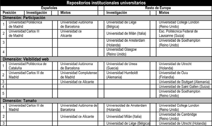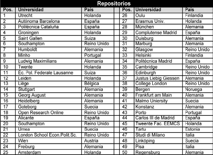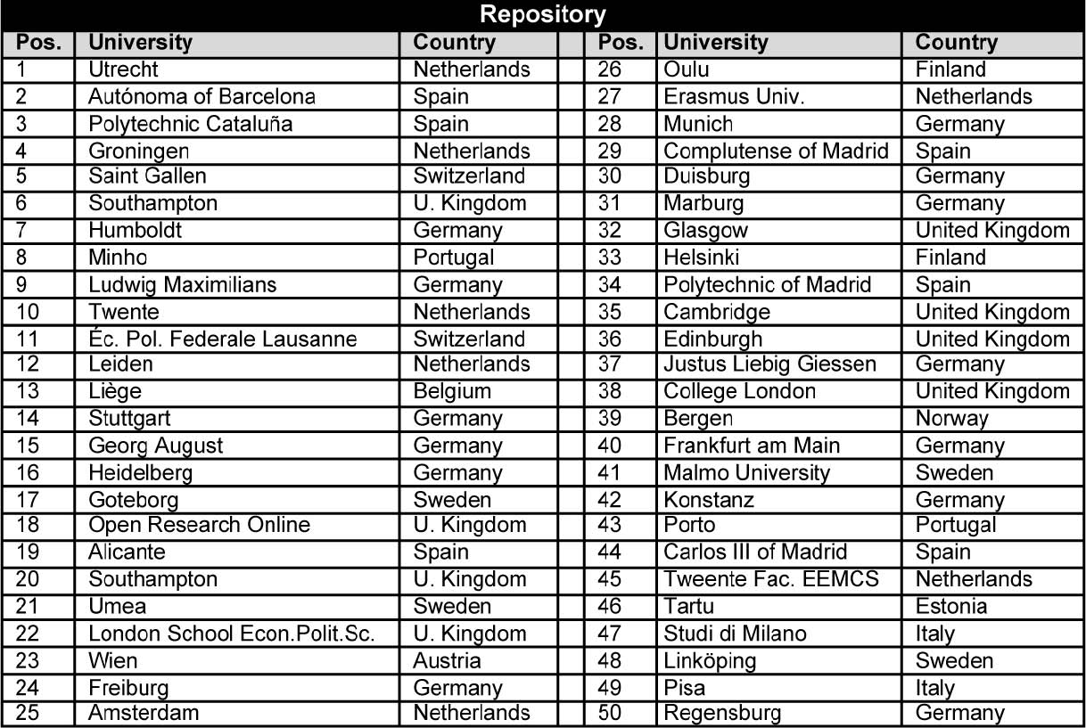 Los Top 50 repositorios europeos analizados se distribuyen de forma que un 12% pertenece a instituciones universitarias españolas y el restante 88% a universidades del resto de Europa. En cuanto al contenido de dichos repositorios, mientras que el 56% alberga exclusivamente resultados de investigación, el 44% restante son repositorios mixtos. Los repositorios considerados poseen por término medio 33.630 documentos digitales, si bien el rango varía entre los 234.760 registros del University College of London (Reino Unido) y los 1.502 de la Universidad de Oulu (Finlandia).