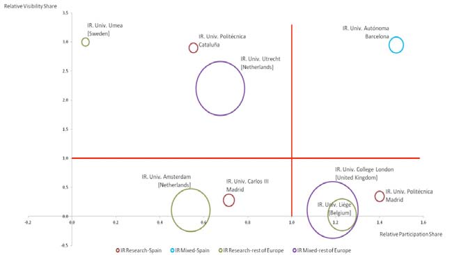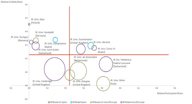 After describing the current situation of university repositories in Europe, we use information visualization (Chen, 2003) to analyze their competitive environment through a comparative map. More precisely, we use a variant of the dispersion diagram that positions Spanish university repositories against those of the rest of Europe in terms of 2 dimensions: their participation and visibility shares compared to the other competitors in their segment; each repository is represented by a circle which is indicative of the volume of digital documents derived from the academic production of the host universities. The analysis by geographical area considers an additional segmentation around the content of the repositories, differentiating those with content derived exclusively from research from those that also include teaching resources (mixed repositories).