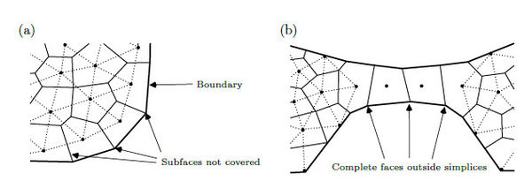 Since we are not making any assumption about the volumes distribution through the mesh, neither about the internal location of its calculation points, then we have to deal with portions of the mesh that are no covered by any simplex. Figure 8 illustrates the two most common cases. The first case takes place in meshes where the calculation points of volumes contiguous to the boundary are in the interior of such volumes, producing subfaces not intersected by any simplex, and the second case occurs when elongated sections of the domain are discretized with a queue of aligned volumes, where each volume has only two neighbors on opposite faces and no simplex can be formed.