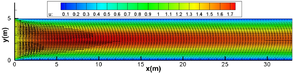 Pode-se ver na figura 9, que somente nos pontos localizados em cima das chicanas, a velocidade na direção atinge seu ponto máximo. Esta previsão é feita no trabalho de Muller e Gibertoni [41]. Na maioria dos pontos do canal a velocidade é menor do que . Este resultado mostra que, de fato, as chicanas exercem seu papel de conter a velocidade da água. A velocidade máxima é menor do que , que é a velocidade máxima permitida para a ocorrência da piracema. Para este estudo de caso, a velocidade só pode ser excedida em cima das chicanas [41]. A figura 10 mostra que, utilizando os mesmos parâmetros de simulação, porém sem as chicanas, a velocidade na direção , é máxima em uma grande região do canal. A comparação entre as figuras 9 e 10, ratifica a importância das chicanas.