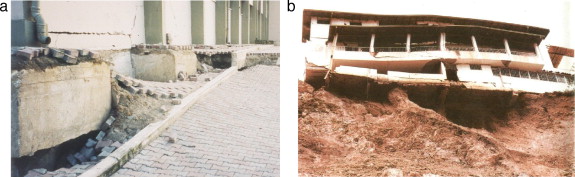 Problemas geotécnicos como los fallos en taludes, desprendimientos de rocas, asentamientos o licuación de suelos afectan la condición global de la edificación. Por lo tanto es importante tener en cuenta el efecto de estos aspectos sobre la estabilidad de los edificios a la hora de evaluar su seguridad; algunos ejemplos se pueden observar en la figura 3 .