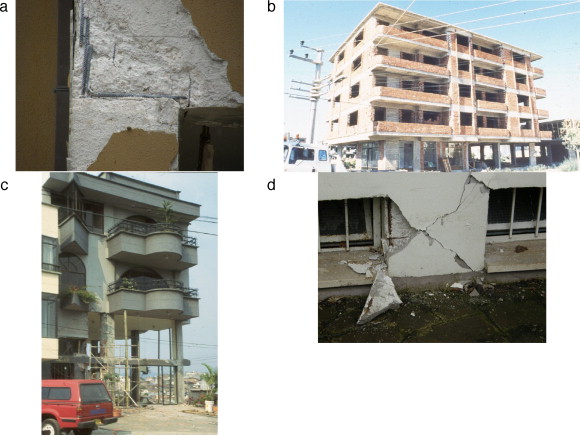 La toma de decisiones sobre la habitabilidad y reparabilidad de los edificios partiendo de los complejos patrones del daño observado es realmente una tarea difícil para profesionales inexpertos. Por ejemplo, durante sismos fuertes, en los edificios porticados de hormigón armado, en los pilares aparecen grietas diagonales a causa del cortante o la torsión; mientras que las grietas verticales, el desprendimiento y aplastamiento del hormigón y el pandeo de la armadura longitudinal se deben usualmente a la flexo-compresión. Los daños más comunes en vigas son las fisuras diagonales y la rotura de los estribos debido al cortante o torsión, así como grietas verticales, fallo longitudinal del acero y aplastamiento del hormigón debido a la flexión a cargas alternantes. Las uniones viga-pilar usualmente muestran grietas diagonales como resultado del cortante y su fallo se debe comúnmente a la falta de anclaje de la armadura longitudinal de las vigas en el nudo o debido a la flexión excesiva. Los forjados pueden presentar fisuras a cortante alrededor de los pilares y grietas longitudinales debidas a la flexión excesiva. El daño en los elementos no estructurales representa un gran porcentaje del daño total causado por un terremoto. Habitualmente esto se debe a la falta de conexiones apropiadas entre los tabiques, instalaciones u otros componentes no estructurales y la estructura. También se puede producir por la flexibilidad lateral excesiva de las estructuras, lo que se traduce en un excesivo desplazamiento relativo entre los pisos. Las grietas diagonales son comunes en los muros divisorios y en las fachadas de mampostería. El aplastamiento de las uniones entre estructuras y los elementos no estructurales, el desprendimiento de los acabados, la rotura de vidrios y de instalaciones de diferente tipo. El desprendimiento de elementos no estructurales puede representar un riesgo para la vida pero no genera, normalmente, el colapso de los edificios. Los niveles de daño en los diferentes elementos estructurales y no estructurales de edificios con diferentes tipologías están ilustrados en las Figura 1 and Figura 2 .