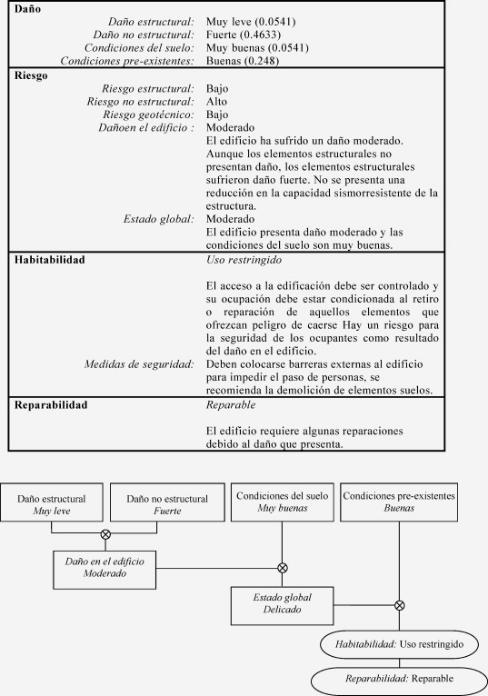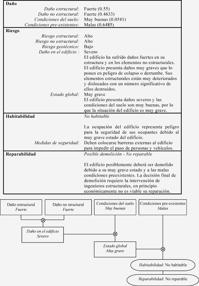 La habitabilidad y la reparabilidad de las estructuras se valoran con base en los resultados obtenidos para el nivel de daño de los elementos estructurales y no estructurales, el estado de las condiciones del suelo y las condiciones pre-existentes. La figura 10 muestra el uso de las reglas difusas para estas estimaciones. El nivel de daño global del edificio se deduce a partir de los valores de los resultados del daño estructural y no estructural. El estado global del edificio y la habitabilidad se determinan teniendo en cuenta el daño global del edificio y las condiciones del suelo en dos diferentes bases de reglas difusas. Las calificaciones lingüísticas para la habitabilidad de la estructura tiene cuatro niveles posibles: habitable (inmediatamente habitable), uso restringido (habitable después de reparaciones), peligroso (habitable después de reforzamiento estructural) y prohibido (no habitable). La reparabilidad depende de otra base de reglas lógicas que contempla las condiciones preexistentes del edificio. La reparabilidad tiene cuatro posibles niveles: ninguna, reparaciones menores, reparación, reforzamiento y posible demolición .