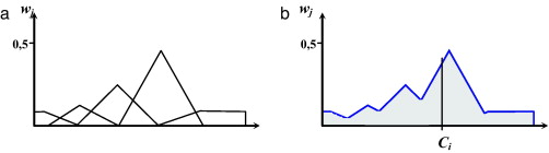 Figura 8. Evaluación del nivel de daño para elementos estructurales. a) Conjuntos difusos; b) envolvente de la unión de los conjuntos difusos. El punto Ci corresponde al centroide de área limitada por la envolvente. |