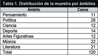 Para la selección de la muestra (aleatoria, no estratificada) se empleó el Chambers Biographical Dictionary (1997). Se utilizaron números aleatorios de dos dígitos, para determinar un número de página inicial y se tomaba el personaje que estuviera descrito en esa página, siempre y cuando su producción se produjera durante el siglo XX. En caso contrario, se generaba otro número aleatorio. Se iba repitiendo este procedimiento hasta llegar al final del diccionario y habiendo alcanzado una muestra final de 120 personajes. El siguiente número aleatorio se sumaba al valor de la página actual y así sucesivamente hasta recopilar una muestra de 120 personajes.