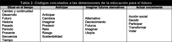 En la Tabla 1 se resumen los documentos analizados y las características de los docentes entrevistados. Se han seleccionado aquellos documentos que son equivalentes en los tres países. Asimismo, se detallan algunas de las características de los docentes en activo consultados, los cuales poseen una notable trayectoria en la educación primaria o secundaria y un conocimiento amplio de la realidad educativa de su país. En la primera fase de la investigación, analizamos los planes de estudio con base en una serie de códigos que extraemos a partir de las dimensiones de la educación para el futuro (Tabla 2) que pertenecen al mismo campo semántico y son comunes en los documentos analizados. Estos códigos nos permiten hacer un análisis temático del contenido de los planes de estudios para poder estudiar en qué medida y de qué forma incluyen la educación para el futuro.