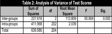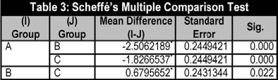 Table 2 shows the results of the comparison of each group’s mean, showing significant differences. Scheffé’s multiple comparison test has shown differences among all class groups. In other words, there are differences between Group A’s scores and Group B’s scores, and between Group A’s scores and Group C’s scores. There are also differences between Group B’s mean and Group C’s mean. Given the significance and sign of mean differences in Scheffé’s test, the means of the groups’ scores are in the following order: A < C < B. That is, Group A’s mean is significantly lower than Group C’s mean and Group B’s mean, while Group C’s mean is significantly lower than Group B’s mean.