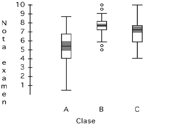 En la gráfica 1 se muestra el diagrama de caja de las notas de cada uno de los grupos, en la que se puede observar como las notas en el grupo A tienen una mayor dispersión, mientras que las de los grupos B, y C están más próximas entre sí a la vez que son más altas, siendo este hecho más acentuado en el grupo B. La mayor homogeneidad de las notas en el grupo B hace que resulten, estadísticamente, valores extremadamente altos y bajos respecto a los de este grupo, quedando señalados por los círculos.