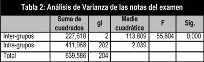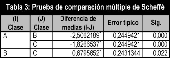 En la tabla 2 se muestran los resultados de la comparación de medias de cada clase, obteniéndose que hay diferencias significativas entre las medias. En la prueba de comparación múltiple de Scheffé (tabla 3), se obtiene que las diferencias se dan entre todos los grupos de clase. Se puede decir, dado la significación y el signo de las diferencias de medias en la prueba Scheffé, que las medias de las notas de clases se encuentran en el siguiente orden A < C < B. Es decir, la media de la clase A es significativamente menor que la media de la clase C y que la media de la clase B y la media de la clase C es significativamente menor que la media de la clase B.