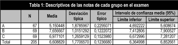 Para comparar las notas de la prueba escrita, se ha realizado un análisis de varianza con los tres grupos, ya que los dos grupos experimentales han mostrado evoluciones distintas como grupo. Esto pudo ser debido a que durante el primer curso del grado, los estudiantes forman equipos de trabajo con más, o menos, aciertos, ya que no suelen conocerse entre sí, y que con el transcurso del tiempo se van consolidando y rehaciéndose en otros equipos de trabajo con diferentes componentes. Este fenómeno común para los primeros cursos de los grados tuvo mayor incidencia y problemática en el grupo C, donde se produjo este fenómeno en mayor número de ocasiones. Los tamaños de los grupos eran iguales, aunque al final hay una ligera diferencia de 2 en el número de estudiantes del grupo de control, como se muestra en la tabla 1.