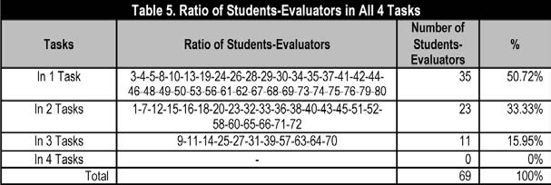 The above analysis proves that teacher training with no evaluation criteria and no guidance from the teacher (as is the case of eRubrics) does not guarantee the necessary skills for students to evaluate in a more objective and specific manner over time. This fact can also be seen in Table 6, which shows the ratio of students-evaluators identified by their list number, whose assessments or criteria coincide with the eRubric assessments for tasks 1, 2, 3 or 4. There are no coincidences in the assessments of peer evaluators in all 4 tasks of the subject, while the highest percentage is 50.72% in the assessments of the first task.
