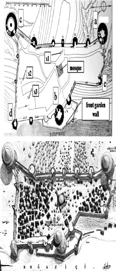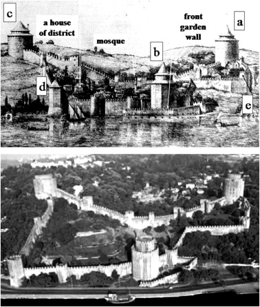 The front garden wall (hisar peçe), bosphorus observation point, lead-covered conical rooftops of towers, internal furnishing of towers, mosque in the garden, district, and springs were destroyed. The front garden wall (hisar peçe), observation point (e), towers (a, b, c, d), springs (s1, s2, s3), and mosque are shown in Fig. 11 , Fig. 4 ; Fig. 6 (Erişmiş, 2012 ).