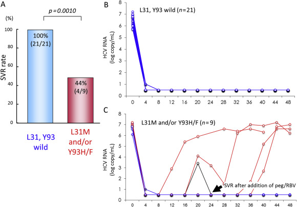 Outcome of daclatasvir plus asunaprevir therapy stratified by presence of baseline NS5A substitutions during a Phase III clinical trial at Hiroshima University. Amino acid sequences of L31 and Y93 before daclatasvir plus asunaprevir therapy were determined by population sequencing. (A) SVR rate following daclatasvir plus asunaprevir therapy with respect to baseline NS5A substitutions; (B) time course of HCV RNA levels in patients with wild type HCV NS5A L31 and Y93 amino acids; and (C) time course of HCV RNA levels in patients with preexisting NS5A L31M and/or Y93H/F substitutions. HCV = hepatitis C virus; RNA = ribonucleic acid; SVR = sustained virological response.