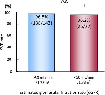 SVR rates in patients with respect to renal function. The SVR rate did not differ significantly between patients with renal dysfunction (right; eGFR < 50 mL/min/1.73m2 ) compared with patients with normal renal function (left; eGFR ≥ 50 mL/min/1.73m2 ). eGFR = estimated glomerular filtration rate; ns = not significant; SVR = sustained virological response.