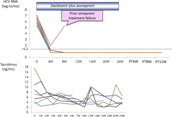 Eight patients with HCV infection after liver transplantation were treated with daclatasvir plus asunaprevir therapy. Figure 5 showed the changes of serum HCV RNA levels of the eight patients. Although one patient with prior simeprevir treatment failure developed viral breakthrough, the remaining seven patients achieved SVR. All patients received tacrolimus for immunosuppression. During the combination treatment, the changes of trough blood concentration of tacrolimus were minimal. No particular adverse events were observed during the therapy.