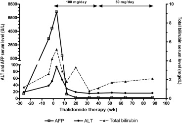Changes in serum α-fetoprotein (AFP) levels before and after thalidomide therapy. ALT = alanine aminotransferase.