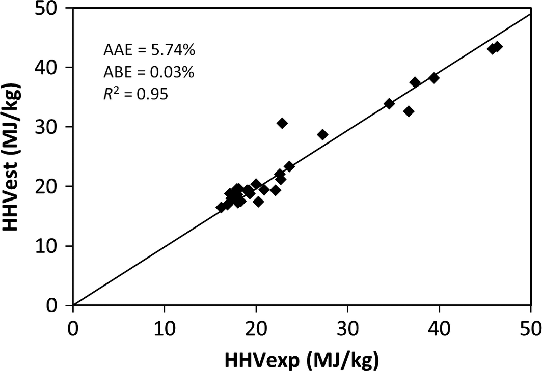 Three statistical parameters were used as evaluating parameters for both HHV and the standard entropy of MSW, which are computed as follows: