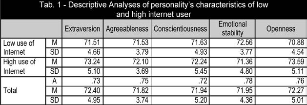 Descriptive Analyses of personality in the two groups are synthesized in table 1. Participants reported to be on line with a mean of 21.66 hours (SD=20.26) for weak: low users remain on line with a mean of 7.19 (SD=4.33), while high users of internet reported a mean of 35.21 (SD=19.99).