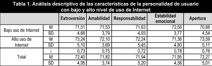 Los análisis descriptivos de personalidad en los dos grupos se sintetizan en la tabla 1. Los participantes hicieron un informe sobre el tiempo en línea con una media de 21,66 horas (SD=20,26) para un uso débil: usuarios bajos permanecen en línea con una media de 7,19 (SD=4,33), mientras los altos usuarios de Internet hicieron un informe con una media de 35,21 (SD=19,99).