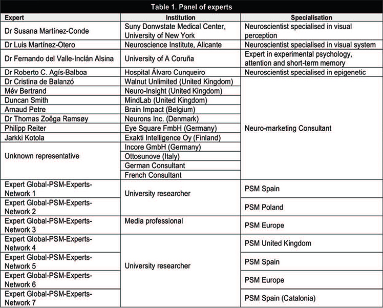 The contact of experts was developed in three stages. The first stage consisted in requesting the collaboration of academic experts and professionals in PSM belonging to the Global PSM Experts Network (https://globalpsmexperts.net/), with the aim of getting a preliminary diagnosis of the state and the main challenges of PSM in Europe. The second stage addressed the state of the art with the collaboration of international consultants, who are members of the Neuro-marketing Science & Business Association (NMSBA). This group revealed the Neuro-marketing research practices used by public broadcasters (method, objectives and object of study), and assessed its future viability in the media arena.