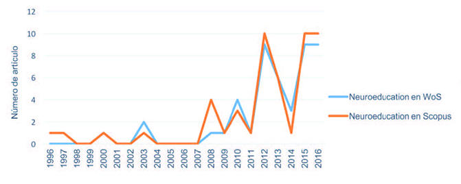 Estudios recientes señalan la influencia directa de la emoción sobre el aprendizaje, a la vez que evidencian la capacidad de la Neurociencia para innovar en la enseñanza (Immordino-Yang & Damasio, 2007). Las nuevas Tecnologías de la Información y Comunicación abren originales fórmulas para conectar emocionalmente con las audiencias motivando así novedosas aproximaciones teóricas y metodológicas (Serrano-Puche, 2015) y su efectiva incorporación en el proceso de aprendizaje (Wellings & Levine, 2009). El impulso de la Neurociencia en el campo de la educación es relativamente incipiente y poco profuso (Gráfico 1). Desde que existen registros, la base de datos Scopus identifica 52 artículos bajo el tema «Neuroeducation» y la Web of Science, 46. En ambas se han encontrado un total de tres referencias bajo «audiovisual neuromarketing», ninguna de las cuales trata la televisión como plataforma para la Neuroeducación. Sin embargo, el interés sobre las Neurociencias está presente en las memorias anuales de las radiotelevisiones públicas europeas.