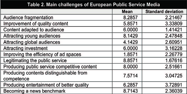 Public service broadcasters in Europe are in the midst of a transition crisis, due to digitisation (Iosifidis, 2011; Cunningham, 2015; Brevini, 2015; Trappel, 2016) and the weakening of their legitimacy (Camacho, 2005). PSM experts consulted (n=7) stated that the main challenges are the need to renew and recover lost and not-reached audiences and to produce public service contents to renew PSM´s legitimacy and their leading position (Table 2).