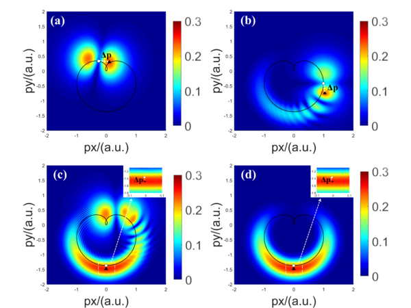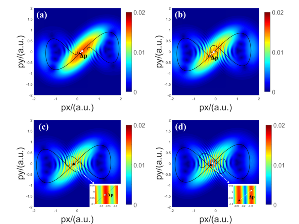 Figure 2 shows four chosen PMDs at the moments: (a) , (b) , (c) , and (d) . More details in Figure 2(a)-(d), the black closed curve is the negative vector potential of the CP laser pulse, the white dots denote the negative vector potential corresponding to the electric-field peak intensity, the black triangles denote the maximum ionization rate of the PMDs. Among them, is the offset difference between the white dots and the black triangles, as known as the momentum shift in nonadiabatic tunneling ionization [34].