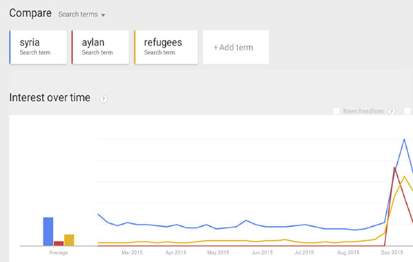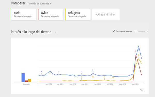 Su fotografía funcionó como una imagen desencadenante. Apareció en la mayoría de los principales medios de comunicación del mundo en un aluvión de portadas y noticias (gráfico 1) y provocó que Siria fuera tendencia en las búsquedas de Google (gráfico 2). Estos gráficos dan muestra del poder reactivo de una imagen al provocar una actitud masiva de búsqueda de información. Antes de que apareciera en los periódicos, la noticia había empezado a replicarse en las redes sociales. Se comunicaba con la imagen. Reuters recogió como noticia el propio poder de «viralización» de la fotografía, vinculando en redes el mensaje en inglés «Inquietante imagen de niño ahogado atrapa la mirada, horroriza» (Reuters, 2015). La imagen y su impacto era crónica en sí misma, por su capacidad de impresionar (horrorizar).