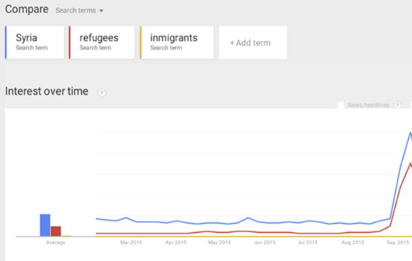 Graph 1. Evolution of the number of headlines (Google Trends) with terms such as «Syria», «refugees» and «immigrants» in 2015 (09-12-2015) (http://goo.gl/HLPUe4).