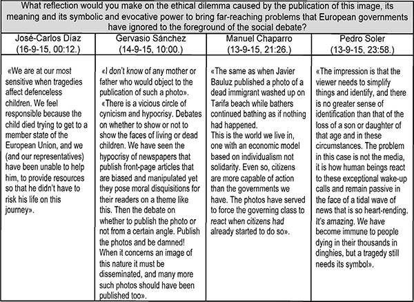 El debate ético sobre una imagen como la de Aylan plantearía aspectos como la gravedad y pertinencia de su publicación; la instrumentalización del documento de registro con fines mercantiles (vender periódicos, captar audiencias, etc.) o la posible morbosidad del consumo de la imagen dramática. Plantearía cuestiones sobre el tratamiento de la imagen de niños y niñas (Espinosa & al., 2007). Podría atender el dilema de la difusión extensiva y los derechos de autoría. Pero, ¿dónde se percibía el foco del dilema ético? A continuación desglosamos una selección de opiniones recabadas de cuatro expertos en torno al debate de la imagen.