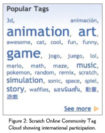 The number of individuals viewing and uploading content to Scratch from countries around the world suggests that it is a genuinely international phenomenon. It is a computer clubhouse on a global scale and its international take up shows that it has potential to be a cross cultural tool for the creative use of technology. Some of the site’s affordances have led to its level of success internationally. For example, for users originating in Mexico and Israel, some of the sections of the home page are customized to make the experience more localised and available in Spanish and Hebrew. The US developers of Scratch have formed partnerships with collaborators in those countries to support the development of the community there. Another sign of the international nature of Scratch is the «tag cloud» on the front of the Scratch Online Community website (figure 2), which shows the most popular words being used to tag projects in Scratch. These tags are frequently in languages other than English.