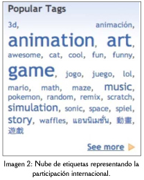 El variado número de usuarios que visualizan y cuelgan contenidos y sus países indica que se trata de un fenómeno internacional, y su nivel de aceptación evidencia el potencial que posee como herramienta transcul-tural para el uso creativo de la tecnología. Algunas características del sitio web han contribuido a su aceptación internacional. Es el caso de las versiones mexicana e israelí, especialmente adaptadas para los usuarios. Los creadores de «Scratch» en EEUU han establecido acuerdos con colaboradores para apoyar el desarrollo de la comunidad. Otro signo de la naturaleza internacional de «Scratch» es la aplicación que se muestra en la imagen 2, diseñada para informar de las palabras más populares para etiquetar proyectos, en varios idiomas.