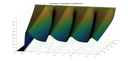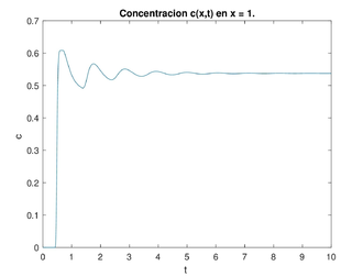 Dado el dominio con y los valores típicos de los parámetros con las ideas anteriores, hicimos un programa para encontrar las soluciones numéricas de la concentración de a través del tiempo y con los datos siguientes para el caso estable (ver figura 6) y para el caso inestable (ver figura 7). La concentración de se representa en unidades adimensionales y la concentración al inicio de la rama ascendente gruesa es 1. La variable también es adimensional; para obtener segundos se debe multiplicar por 15.5 .