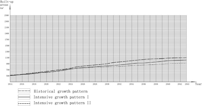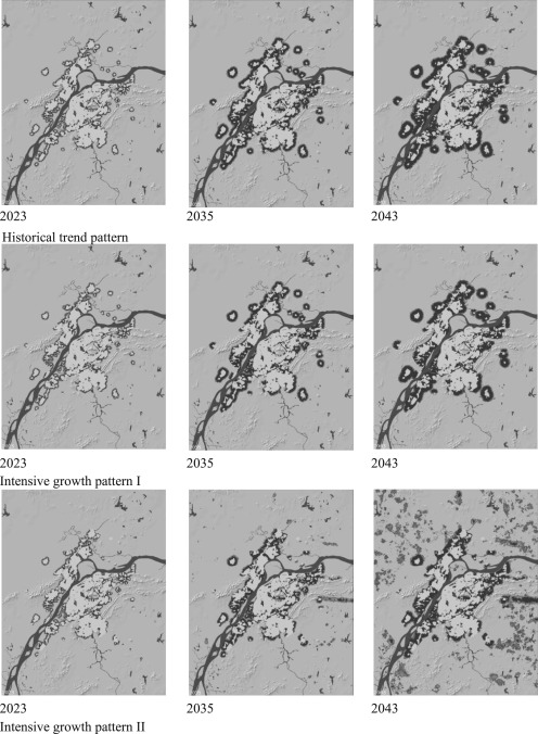 The intensive growth pattern II uses the excluded layers; not only the water body and open park areas that are resistant to urbanization but also the prohibited areas and restricted construction areas in the land use planning in 2006 (2006–2020).